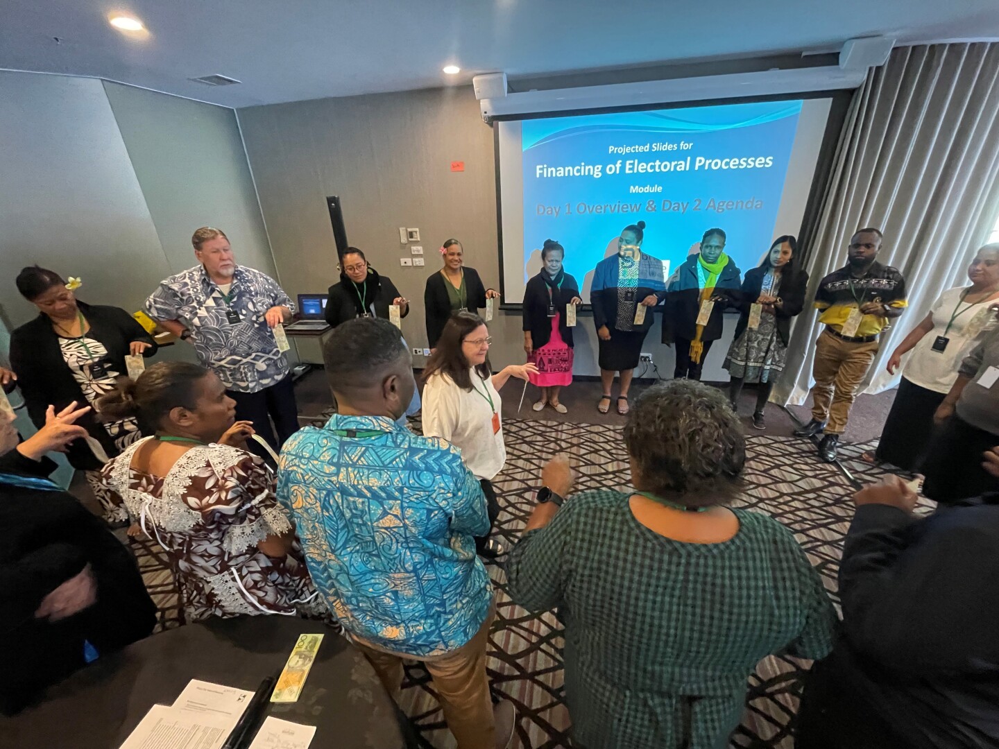 A key feature of the workshop was the sharing of country presentations from Bougainville, Cook Islands, Fiji, Kiribati, Nauru, Niue, Palau, Papua New Guinea, Republic of Marshall Islands, Samoa, Solomon Islands, Tonga, Tuvalu, and Vanuatu. The presentations recorded were essential for future use, highlighted diverse national experiences and emphasised the importance of context specific financial management. The final day focused on applying learning through a practical scenario, where participants developed and presented business cases for supplementary election funding.