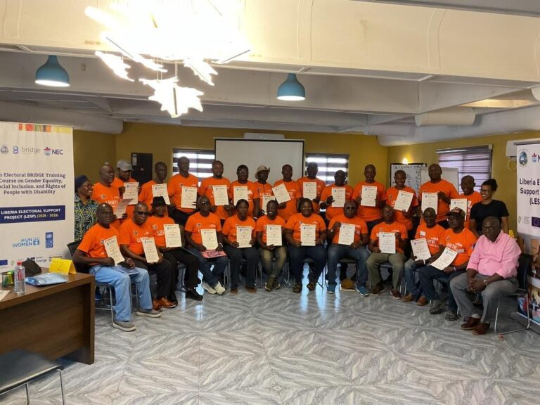 From April 7, through the 9th, 2026, the third and final cohort of the rounds of Bridge Training Course utilizing the modules on Gender, Disability, and Access was conducted. The training used one of the county capitals in Liberia, called Buchanan, as the venue. Twenty-five (25) members of the National Elections Commission (NEC) of Liberia completed three days of training. The course, in addition to strengthening their capacities to understand and relate to issues of gender equality, the wider context of encouraging the inclusion of people with disabilities in electoral processes, as well as, recognizing the rights of this significant sector of society.